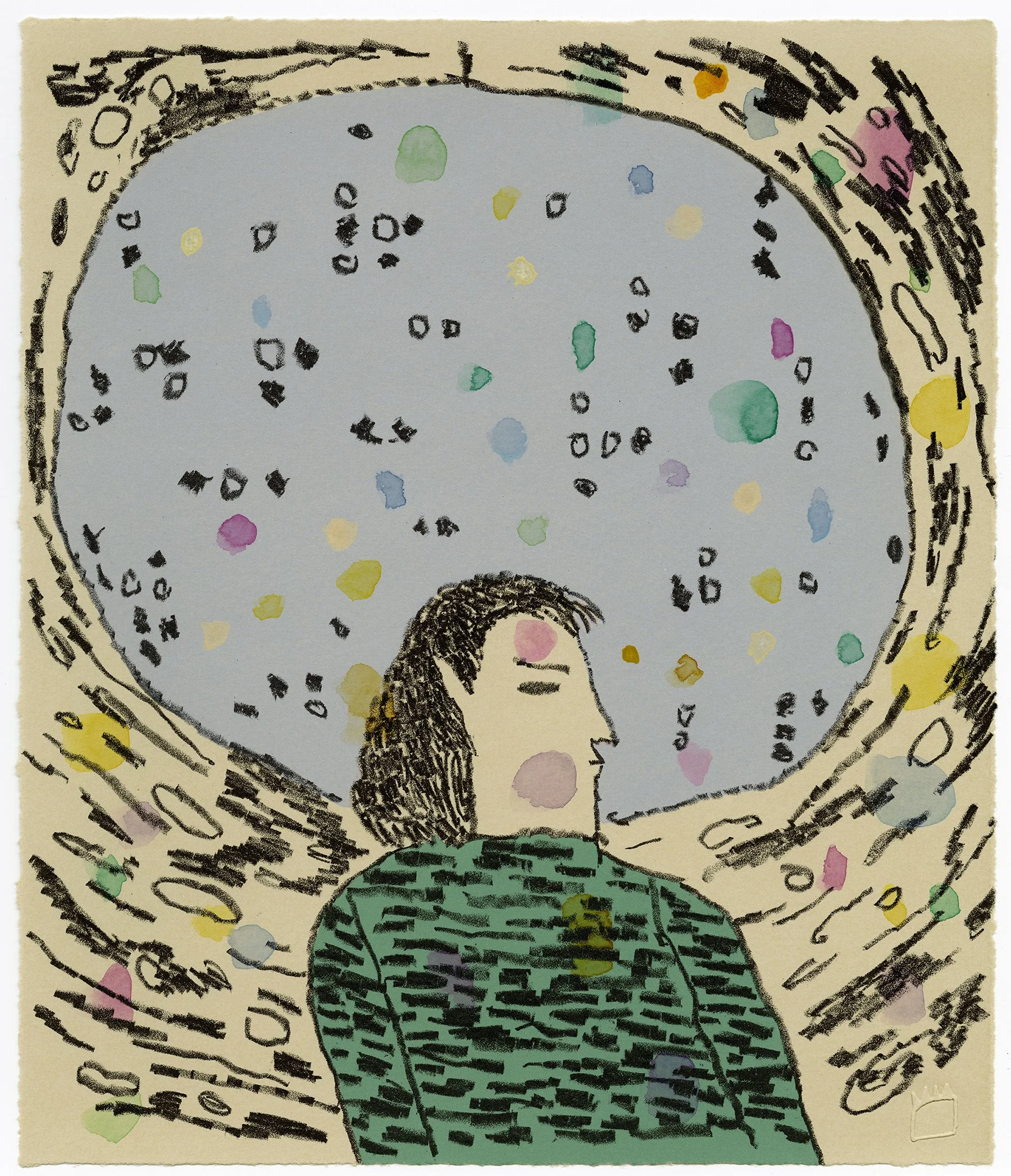 Multi-run stone lithograph with watercolour by the artist.
